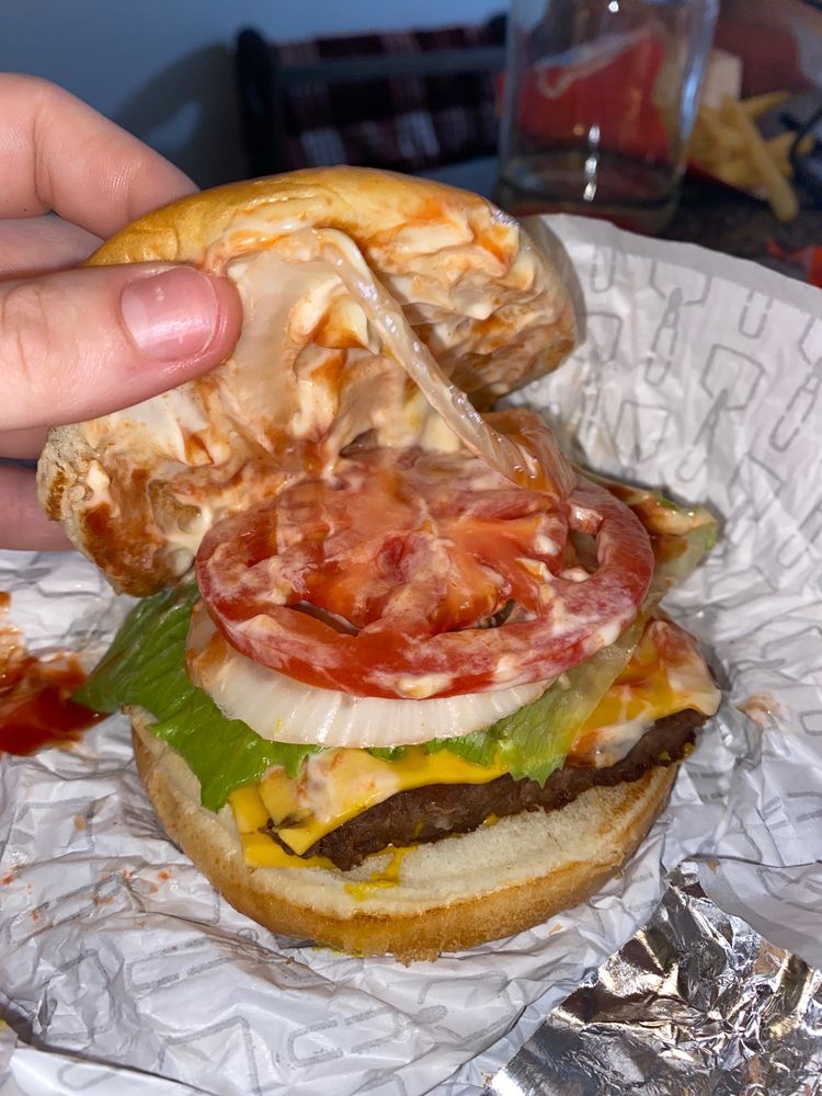 Three quarters of a pound* of fresh, never frozen beef, American cheese, crisp lettuce, tomato, pickle, ketchup, mayo, and onion on a toasted bun. Use both hands!