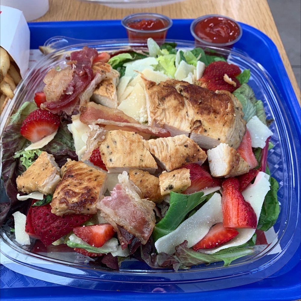 Made fresh daily with Wendys signature lettuce blend, grilled chicken, diced tomatoes, shredded cheddar cheese, chopped eggs, applewood smoked bacon, crispy fried onions, and ranch dressing. A hearty salad you can hardly wait for.