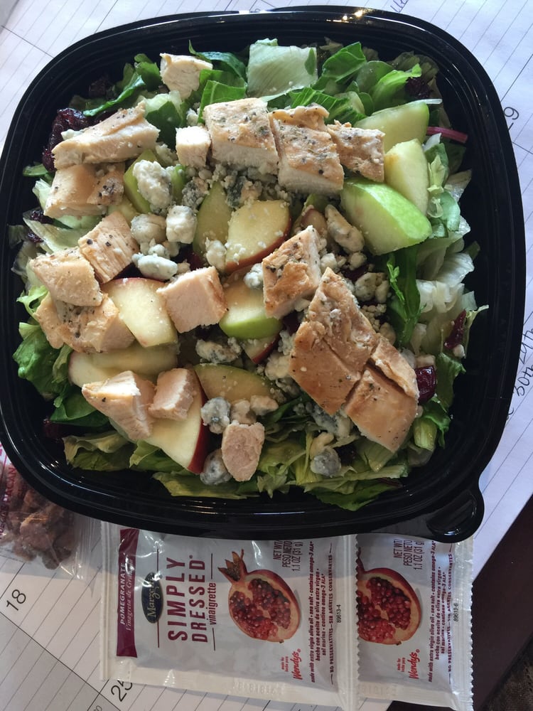 Made fresh daily with Wendys signature lettuce blend, crisp red and green apples, dried cranberries, roasted pecans, crumbled blue cheese, and grilled chicken breast hot off the grill, all topped with Marzetti Simply Dressed Pomegranate Vinaigrette. An unbeatable pick.